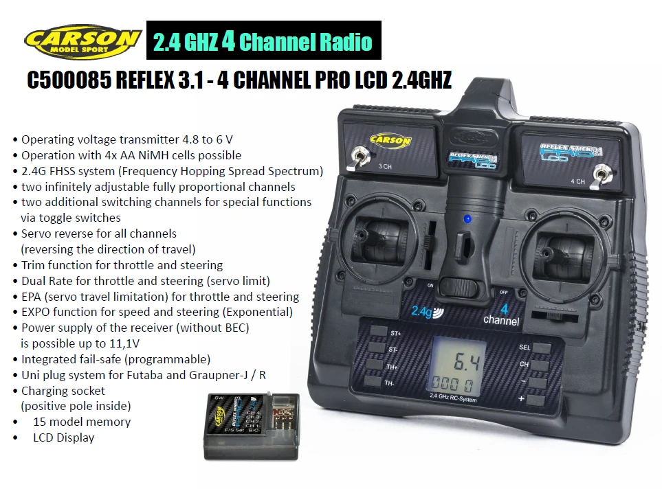 The Carson Reflex Stick Pro 3.1 4 Channel 2.4Ghz Radio Set is ideal for Tamiya R/C Cars if you’re thinking of adding additional functions.