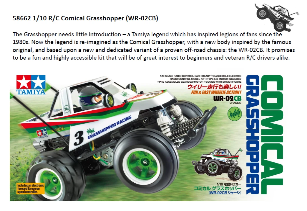 - The original Grasshopper needs little introduction. It was a Tamiya legend which inspired legions of fans since the 1980s. For many, it was their very first introduction into the world of radio control assembly kits. The original Grasshopper is still among Tamiya’s best-selling kits to this day. Now the legend is re-imagined as the Comical Grasshopper, with a new body inspired by the famous original. The re-imagined body sits on a new and dedicated variant of the proven off-road chassis: the WR-02CB.