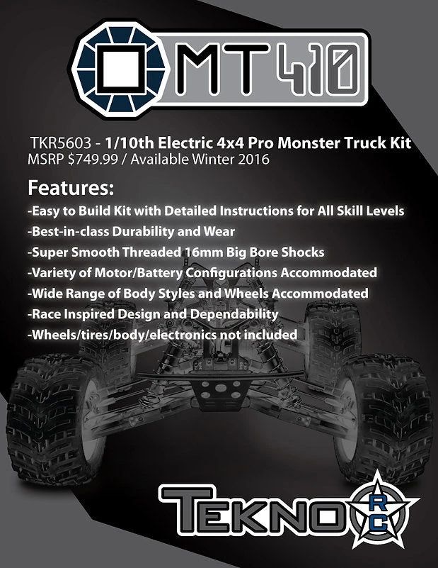 Electric 4×4 Pro Monster Truck KitTekno RC is proud to announce the newest addition to our stable of innovative RC vehicles – The MT410 1/10th Electric 4×4 Pro Monster Truck Kit. The MT410 isn’t your basic, bare-bones, cheap plastic monster truck. It is based on the critically acclaimed ET48 platform that is raced at the highest levels of competition.But why bother with a high-end MT kit? Simple, there’s always room for improvement and in this case, the leap in performance and durability over what the market currently has to offer is astounding. We are using high-quality CNC machined parts (chassis, shock towers, shock bodies, motor mount, hinge pin braces, etc.) that you simply won’t find on basic RTR MT’s.Parts and upgrades are readily available from hundreds of dealers around the world. A lot of them are probably in your tool box already since the MT410 shares parts with the ET48, EB48, and other popular Tekno RC vehicles.Don’t be afraid to build your own MT. The instructions are easy to follow and our customer service is second to none if you need a little help. Most of all, we wanted to have some fun when we’re away from the track (or while at the track in between rounds).